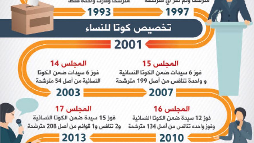 وبدخول الكوتا النسائية للقبة البرلمانية في العام 2003 للمجلس الرابع عشر لم تحصل المرأة سوى على المقاعد الستة المخصصة للكوتا النسائية من أصل 54 مترشحة، لكن أي مترشحة لم تفز بالتنافس.
